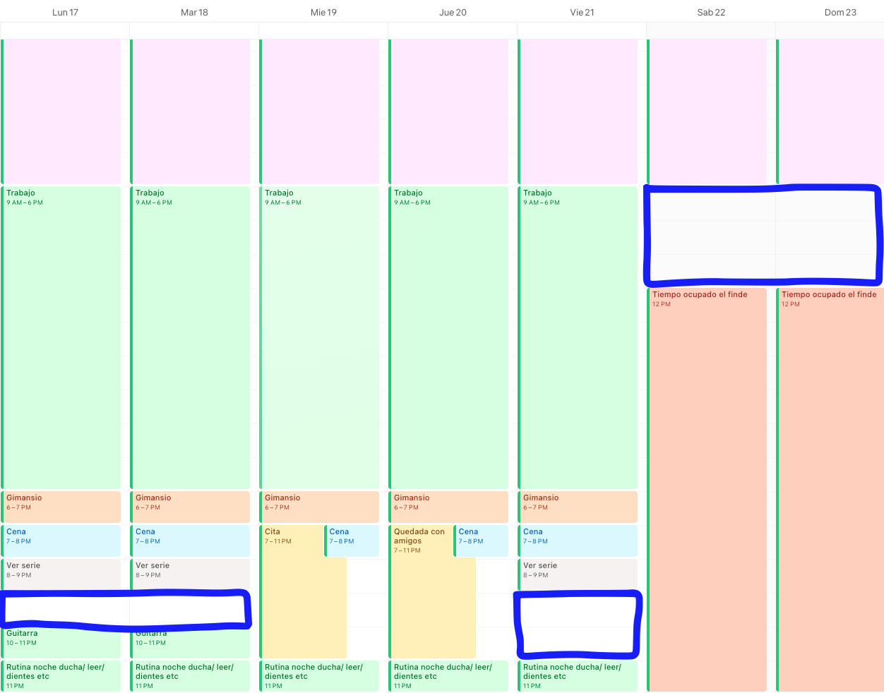 Si colocamos todo esto en un calendario semanal, este sería el resultado: